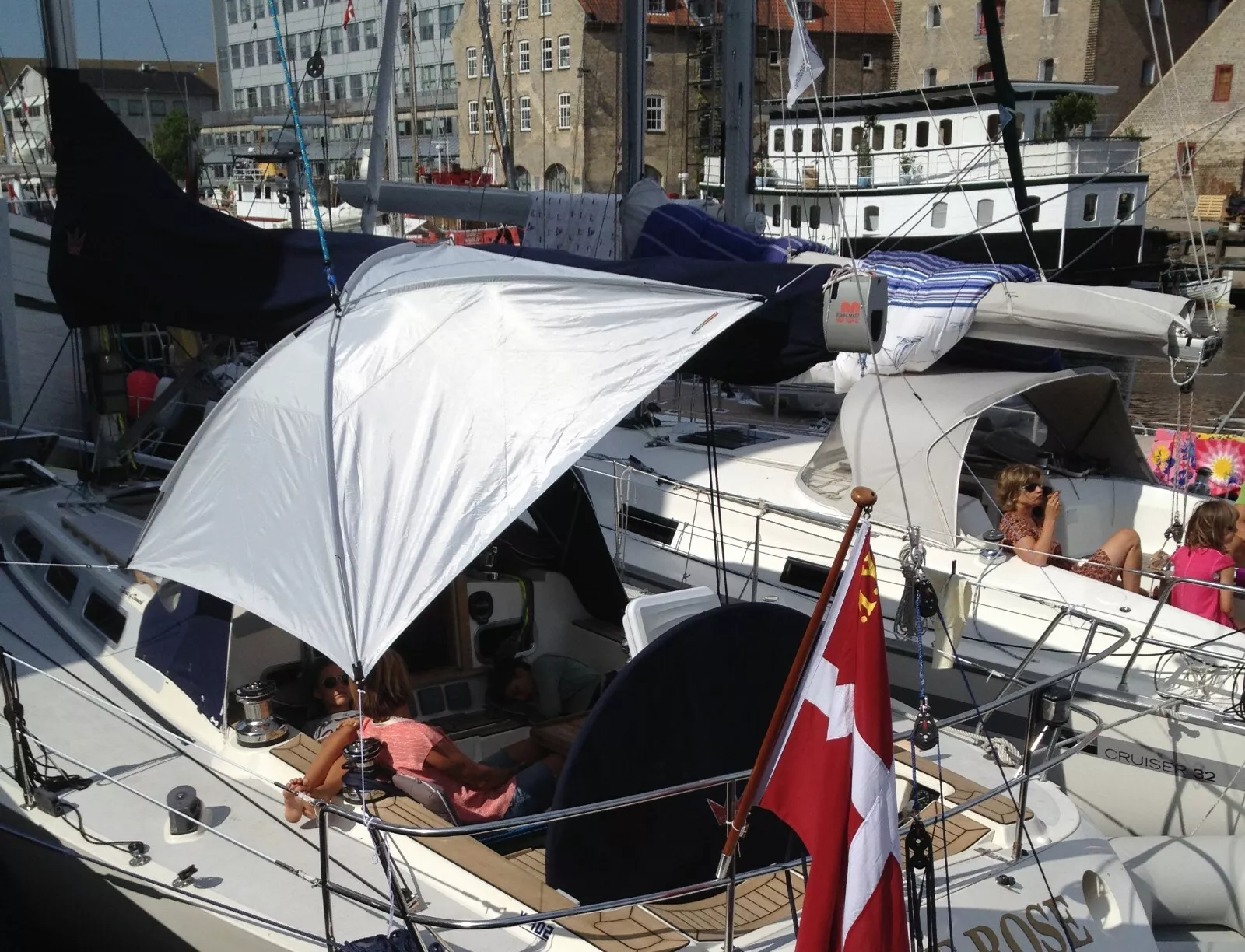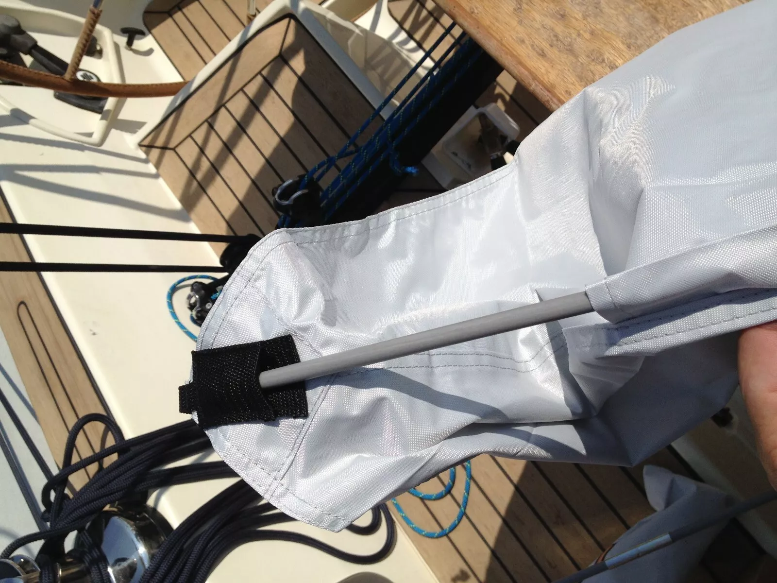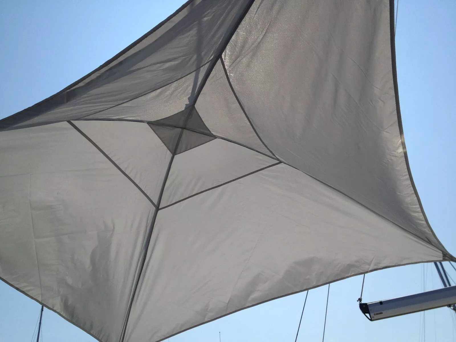 Praktischer Sonnenschutz, der an einem Fall aufgehängt wird. An den Rändern sind Leinen zur Fixierung angebracht.
